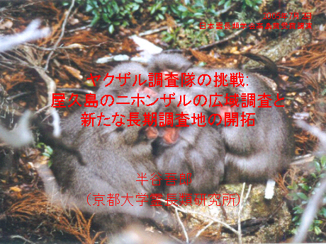京都大学霊長類研究所の半谷吾郎です。本日は、たいへん名誉ある賞をいただき、心から感激しております。今後とも、この賞の名に恥じぬよう、いっそう精進を積んでまいりたいと思います。この賞は形式的には私個人に与えられたものですが、私は、私の研究の根幹をなしている、自称「ヤクザル調査隊」というグループ全体に対して与えられたものだと考えています。この受賞講演では、ヤクザル調査隊がどのようにして始まり、何を明らかにしてきたのか、そしてこれから何を目指しているのかについてお話しようと思います。