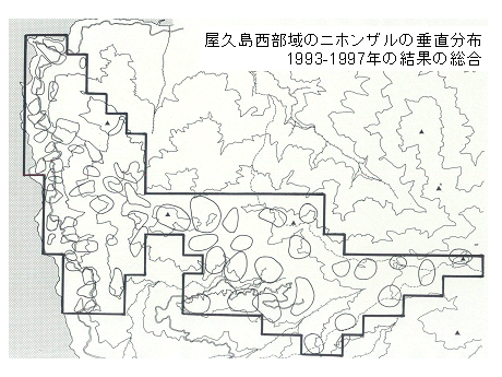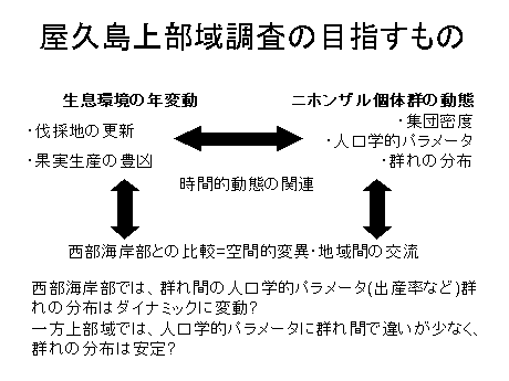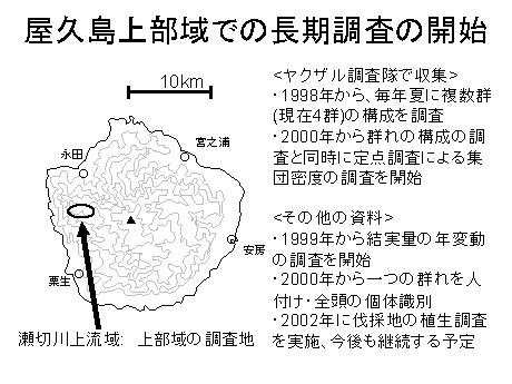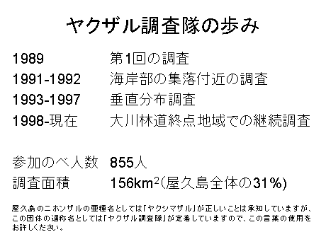 「ヤクザル調査隊」は、毎年夏に、全国から数十人のボランティアの学生や社会人を募って屋久島でニホンザルの分布や個体数調査を行っている人たちの集まりです。第1回の調査が行われたのは1989年です。最初の2回で方法を確立し、次の2回は海岸の集落付近の分布調査、1993年から5年間は垂直分布調査、1998年からは屋久島上部の大川林道終点付近に恒久的な調査地を設け、そこでの継続的な調査を行っています。昨年までで16回の調査を行い、のべ参加者は800人を超えます。
