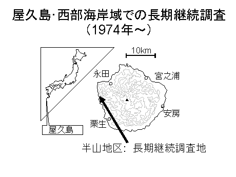 さて、屋久島はニホンザル分布の南限にあたり、野生群の詳細な調査が最初に行われた場所です。1974年以来、屋久島西部海岸では複数の野生ニホンザルの群れを対象とした調査が継続的に行われてきました。