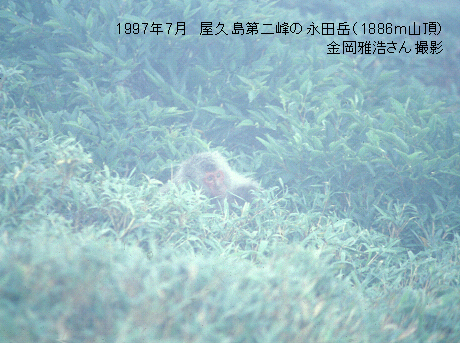 そんなこんなで、なんとか5年間で西部地域の海岸から山頂までの連続的な垂直分布の全貌を明らかにすることができました。この写真は屋久島第二峰、1986mの永田岳にいたニホンザルです。この5年間、わたしたちが苦労して明らかにしてきたのは、「屋久島にはどこまででもサルがいる、それもたくさんいる」という、単純な事実でした。海岸部での密度はこれまで知られていた通り、1km2あたり60-100頭でニホンザルとしては最大、しかしそれ以上の標高帯でも1km2あたり20-30頭の密度で分布しており、これはたとえば北日本のサルに比べればはるかに高い値です。