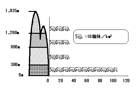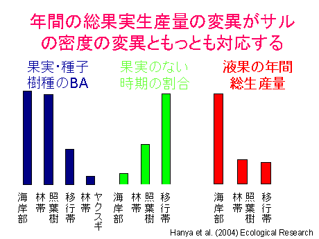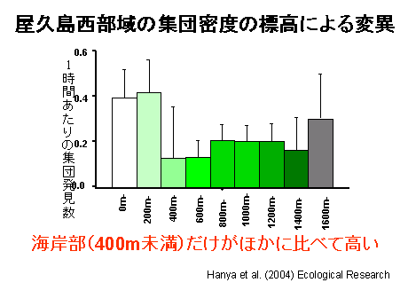 客観的分析法を開発したことで、ようやく垂直分布のデータが日の目を見ることになりました。もう一度全てのデータをフィールドノートにまでさかのぼって分析しなおし、私が博士課程のあいだに集めた生息環境についての資料と対応させ、屋久島のニホンザルの標高による密度の変異の決定要因を明らかにしました。そうしてわかったことは、サルの密度は海岸部だけで高く、それ以上の標高帯では大きな違いがないこと、そしてそのようなサルの密度の変異にもっとも対応しているのは、食物樹の密度や、一年のうち果実の利用できない期間の長さではなく、年間の総果実生産量でした。生息環境のパラメータ、とくに年間の食物の総量と季節性に関するパラメータと密度との関係を同時に検討した研究はきわめて少なく、「動物の密度は何によって決まるのか」という、動物生態学の根幹に迫る研究に発展させることができました。