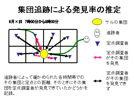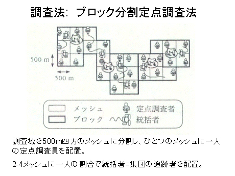 さて、わたしは垂直分布調査が終了した1997年に大学院の1年生でした。大学3年のとき、病気のため参加できなくなった好廣さんに変わって事務局を務めて以来、私が主に調査の運営にあたることになっていました。私は1997年の調査が終わってから、これまでの結果をまとめて、外国の雑誌に投稿しました。1年もかかって返ってきた返事は、その後の研究者人生で私が何度も何度も受け取った却下の通知の中でも、もっともひどいものでした。この調査の方法は、ブロック分割定点調査法といいます。このように調査地を500m四方のメッシュに区切り、そこに一人の定点調査者を配置します。複数のメッシュに一人の集団を追跡する人を配置し、追跡者と定点調査者がトランシーバーで連絡を取り合いながら集団の分布についての情報を集め、最終的に群れの分布を推定するというやり方を取ってきました。そのようにして得られた群れの丸の数を、調査面積で割るという方法で、密度を出していたのです。批判の矛先は、主に調査方法に向けられていました。つまり、調査地域の形によって、密度が影響を受けるとか、4日間の追跡で調査域内にいる群れが全て発見できたとする根拠がない、などです。その後の調査でわれわれがえいやっと書いた群れの分布は、おおむね正しいことがわかりましたが、当然「科学」としては、そのような職人的勘を信じるわけにはいきません。この論文は、私が博士課程の調査を行っている2年間のあいだ、お蔵入りになっていました。