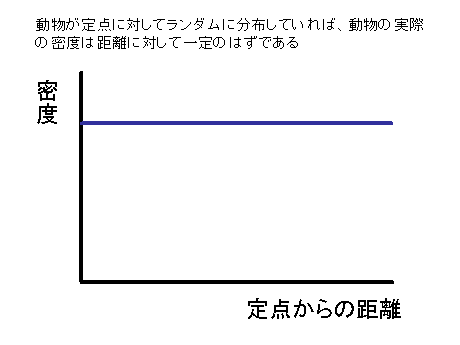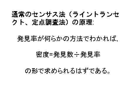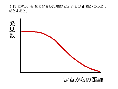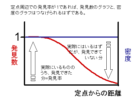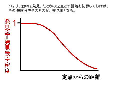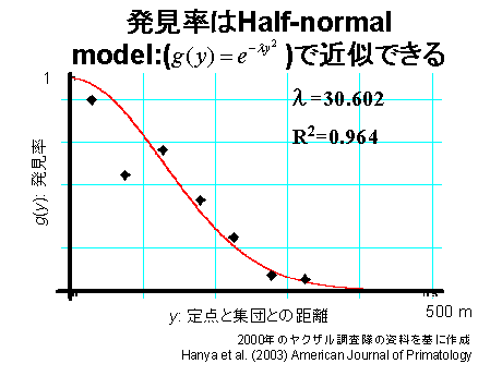 ところが、われわれの調査は定点調査で、主に音声によって集団を発見しています。音声では、集団までの距離が正確にはわからないので、このような分析はできないのです。ところが、われわれの調査では定点調査者のほかに、集団の追跡者を配置しています。そのため、集団追跡の記録と、定点調査の記録を付き合わせれば、発見率を計算できます。つまり、このように、集団と定点との距離が100mになったとき、発見できた、150mのとき発見できなかった、という事例を集めていくのです。それがその結果で、定点と集団との距離はこのような関数に近似できることがわかりました。あとはこのようなモデルを立てて密度を計算します。こうして計算した集団密度は、群れの遊動域から計算した集団密度と一致し、この方法が有効であることが確かめられました。