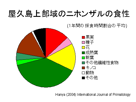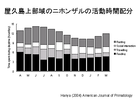 ヤクザル調査隊はその後、屋久島西部、標高1000m付近の大川林道終点地域に拠点を定め、その場所で集団密度と群れの構成に関する長期継続調査を開始しました。この地域にはさまざまな年代に、異なる方法によって更新が行われている伐採が含まれており、その点にも着目して調査を行っています。これはその成果の一部です。また、博士課程に進学した私は、ヤクザル調査隊の成果の上に立って、この場所で2年間の調査を行い、生息環境についての資料を収集するとともに、ひとつの群れを人付け、個体識別して、2年間の調査のうちの後半1年間、行動観察による資料を収集しました。その結果、上部域のニホンザルはニホンザルでは他に類例がないほど葉をたくさん食べること、活動時間配分の季節変異には食物に関わる要因だけでなく、気温が非常に重要な影響を及ぼしていることなどが明らかにしました。現在は行動生態学的な分析を進めており、食物をめぐる競合のパターンが屋久島の海岸部と上部域では異なる一方で、社会関係には変異が少ないことが明らかになってきました。